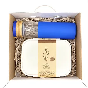 Состав набора: Бутылка стеклянная с силиконовой манжетой и бамбуковой крышкой Glass , белый - 1 шт. (Артикул: 14032.01) Ланчбокс (контейнер для еды) Ulf, бежевый - 1 шт. (Артикул 13003.13) Бумажная стружка (крафт) 50 г.– 2 шт. (Артикул: 00-00080984) Подарочная коробка из МГК 24,5*25,5*10,5 см - 1 шт. (Артикул: 53305)