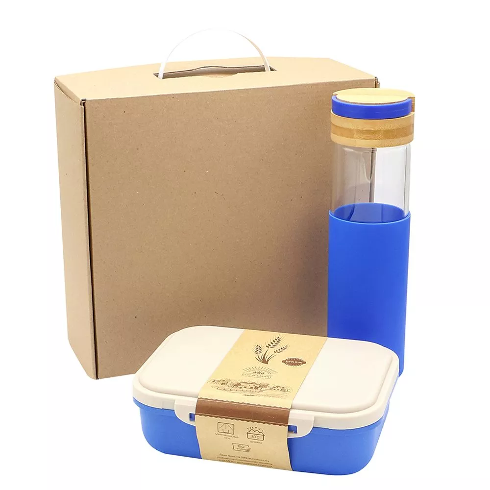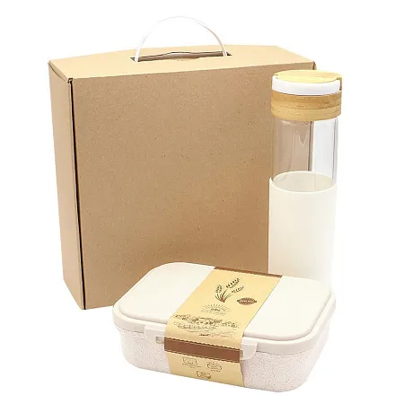 Состав набора: Бутылка стеклянная с силиконовой манжетой и бамбуковой крышкой Glass , белый - 1 шт. (Артикул: 14032.01) Ланчбокс (контейнер для еды) Ulf, бежевый - 1 шт. (Артикул 13003.13) Бумажная стружка (крафт) 50 г.– 2 шт. (Артикул: 00-00080984) Подарочная коробка из МГК 24,5*25,5*10,5 см - 1 шт. (Артикул: 53305)