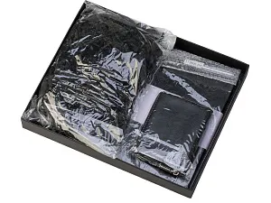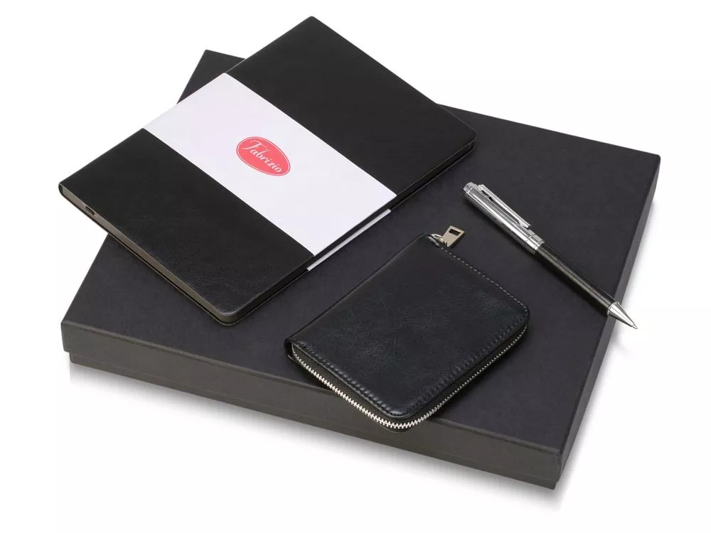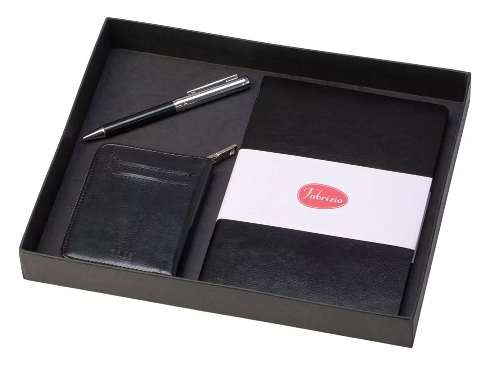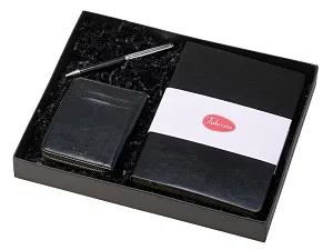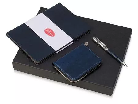 Стильный набор в едином дизайне - идеальный вариант для подарка офисным работникам. Гибкая обложка блокнота выполнена из искусственной кожи, блок блокнота - кремового цвета с цветным срезом и оснащён ляссе в тон обложки. Металлическая шариковая ручка удобна в использовании благодаря вставке из полиуретана в цвет картхолдера и блокнота. Картхолдер имеет RFID защиту от считывания, - ваши карты будут в безопасности! Внутри картхолдера 6 отделений для карт, снаружи - 2 отделения. размер блокнота А5, 80 листов; ручка с нажимным механизмом; стильный офисный мерч. Трафаретная печать (1 цвет (цветные изделия)) на данный товар осуществляется бесплатно. Оплачивается только настройка оборудования в размере 10000 рублей на весь тираж.