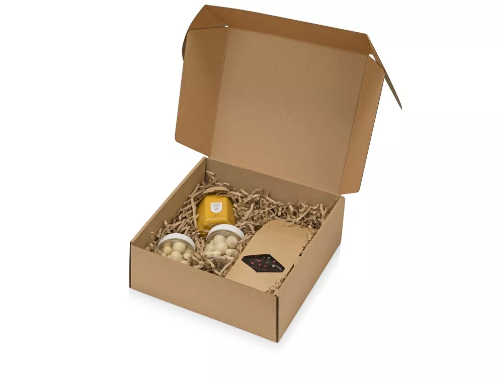 Набор для любителей ягод. В него входят клубника и малина в йогуртовой глазури и баночка крем-мёда с ягодами годжи. Набор упакован в подарочную коробку.