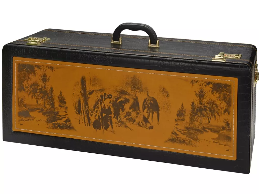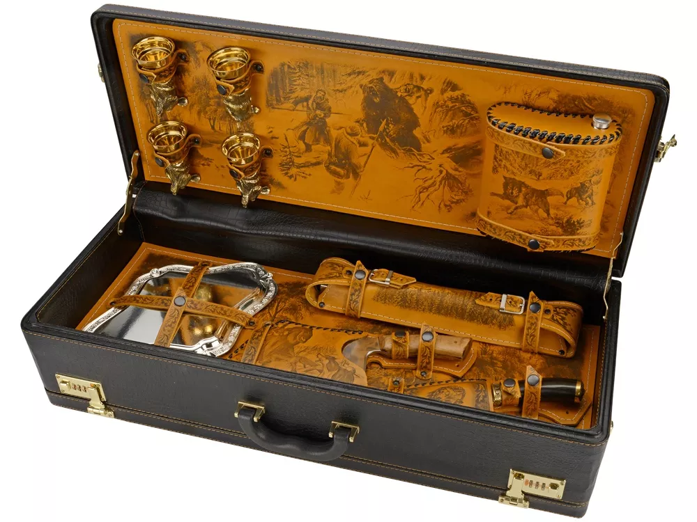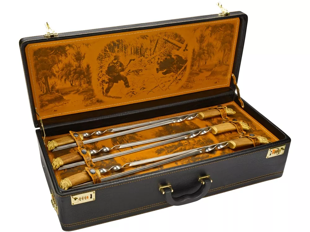 Кейс из сплит-кожи, с повышенной износостойкостью, с картиной В комплект входит: Шампура Люкс - 6 шт. Поднос (нейзильбер)- 4 шт. Стопка чарка- 4 шт. Нож разделочный (нерж.сталь) с рисунком- 1 шт. Нож Тюльпан (нерж. сталь) – 1 шт. Фляжка 1л в чехле- 1 шт. Мангал 350мм- 1 шт.