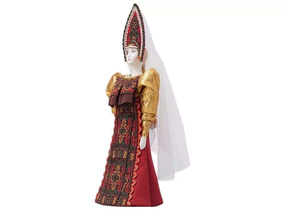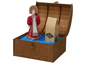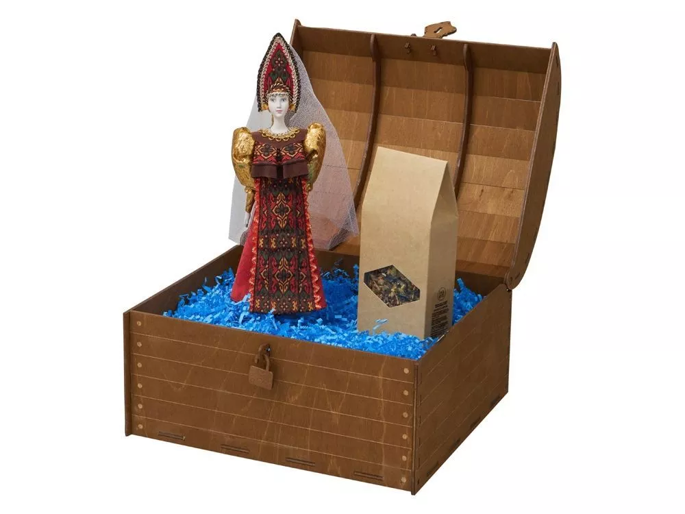 Подарочный набор с фарфоровой куклой и ароматным чаем. Гармония русских традиций, уюта и изысканного вкуса воплотилась в этом изысканном подарке. Набор станет прекрасным презентом для близких, деловых партнеров или иностранных гостей, желающих прикоснуться к русской культуре. Комплектация: - Фарфоровая кукла в народном костюме ручной работы: алый сарафан с пышными рукавами и расшитый кокошник создают образ русской красавицы в праздничном наряде. - Фруктовый чай Малина с мятой (70 г) с нежным ягодным вкусом и освежающим мятным послевкусием. Идеальное дополнение для душевных посиделок. - Стильное оформление: синяя декоративная стружка подчеркивает благородство подарка и надежно фиксирует его содержимое. Особенности упаковки: Деревянный сундучок с замочком превращает набор в драгоценный ларец. Возможность нанесения именной таблички добавляет презенту индивидуальности, делая его по-настоящему памятным подарком.