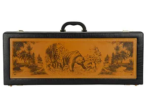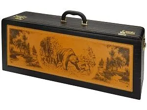 Кейс из сплит-кожи, с повышенной износостойкостью, с картиной, внутренняя отделка натуральная кожа с художественным выжиганием. В комплекте: Стопка 40мл (нейзильбер)– 6 шт. Нож Тюльпан (нерж. сталь) 45х13, рукоять орех, бронзовое литье, в чехле с художественным выжиганием– 1 шт. Нож разделочный (нерж. сталь) 45х13, рукоять орех, бронзовое литье в чехле из натуральной кожи с выжиганием– 1 шт. Нож выкидной, ручка орех- 1шт. Шампура 630 мм (нерж. сталь), ручка орех, бронзовое литье– 6 шт. Поднос (нейзильбер)– 6 шт. Мангал 350мм -1шт. Шампура 350мм, в чехле из натуральной кожи с декором-6шт.