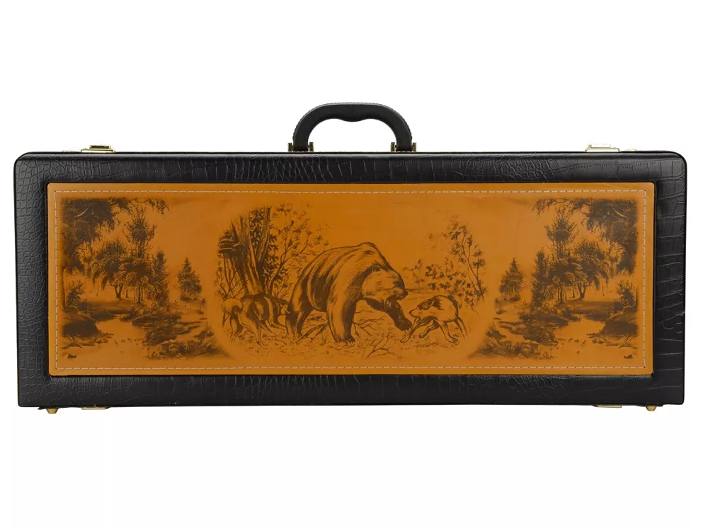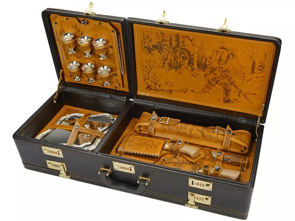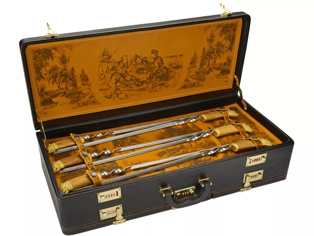 Кейс из сплит-кожи, с повышенной износостойкостью, с картиной, внутренняя отделка натуральная кожа с художественным выжиганием. В комплекте: Стопка 40мл (нейзильбер)– 6 шт. Нож Тюльпан (нерж. сталь) 45х13, рукоять орех, бронзовое литье, в чехле с художественным выжиганием– 1 шт. Нож разделочный (нерж. сталь) 45х13, рукоять орех, бронзовое литье в чехле из натуральной кожи с выжиганием– 1 шт. Нож выкидной, ручка орех- 1шт. Шампура 630 мм (нерж. сталь), ручка орех, бронзовое литье– 6 шт. Поднос (нейзильбер)– 6 шт. Мангал 350мм -1шт. Шампура 350мм, в чехле из натуральной кожи с декором-6шт.