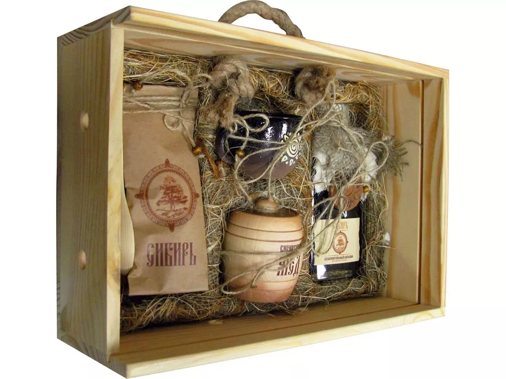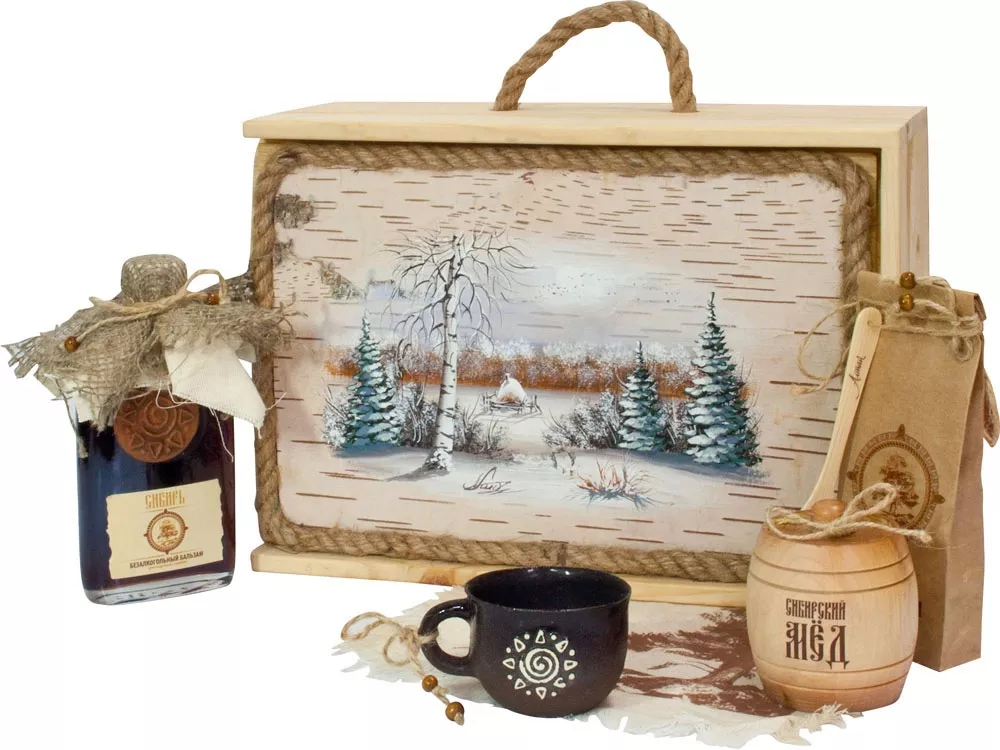 Подарочный набор в уникальном деревянном коробке с рисунком на бересте:: безалкогольный бальзам Сибирь, зеленый чай из целебных, сибирских трав, настоящий сибирский мед в бочонке, кедровая ложка, льняная салфетка, керамическая чашка.