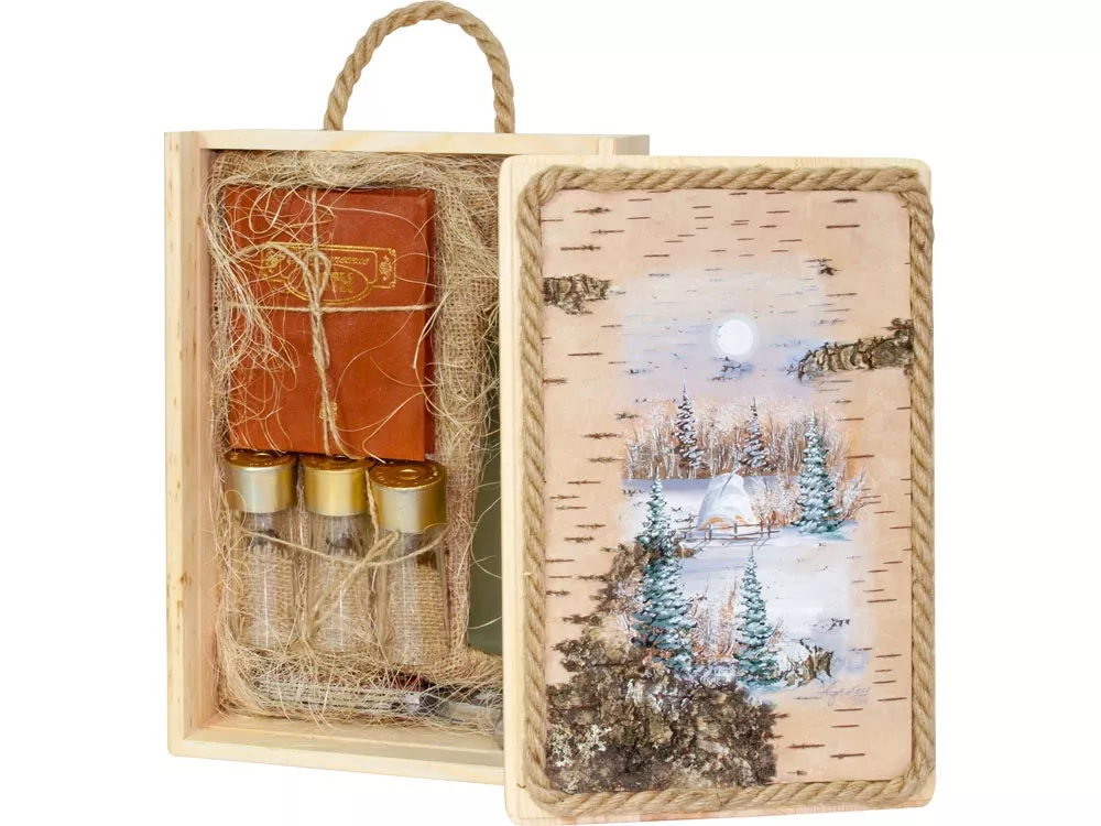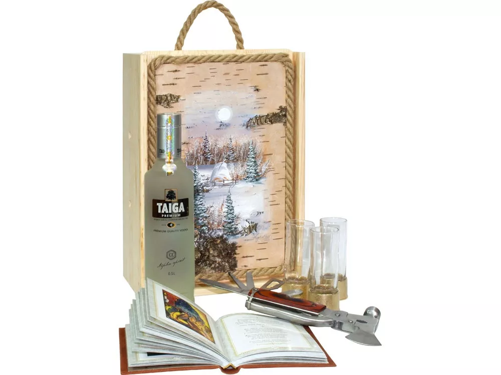 Подарочный набор в уникальном деревянном коробке с рисунком на бересте: книга, в которую входят лучшие тосты XX века, три стопки в виде патронов, уникальный таежный нож с множеством функций. Место для бутылки водки 0.5л.