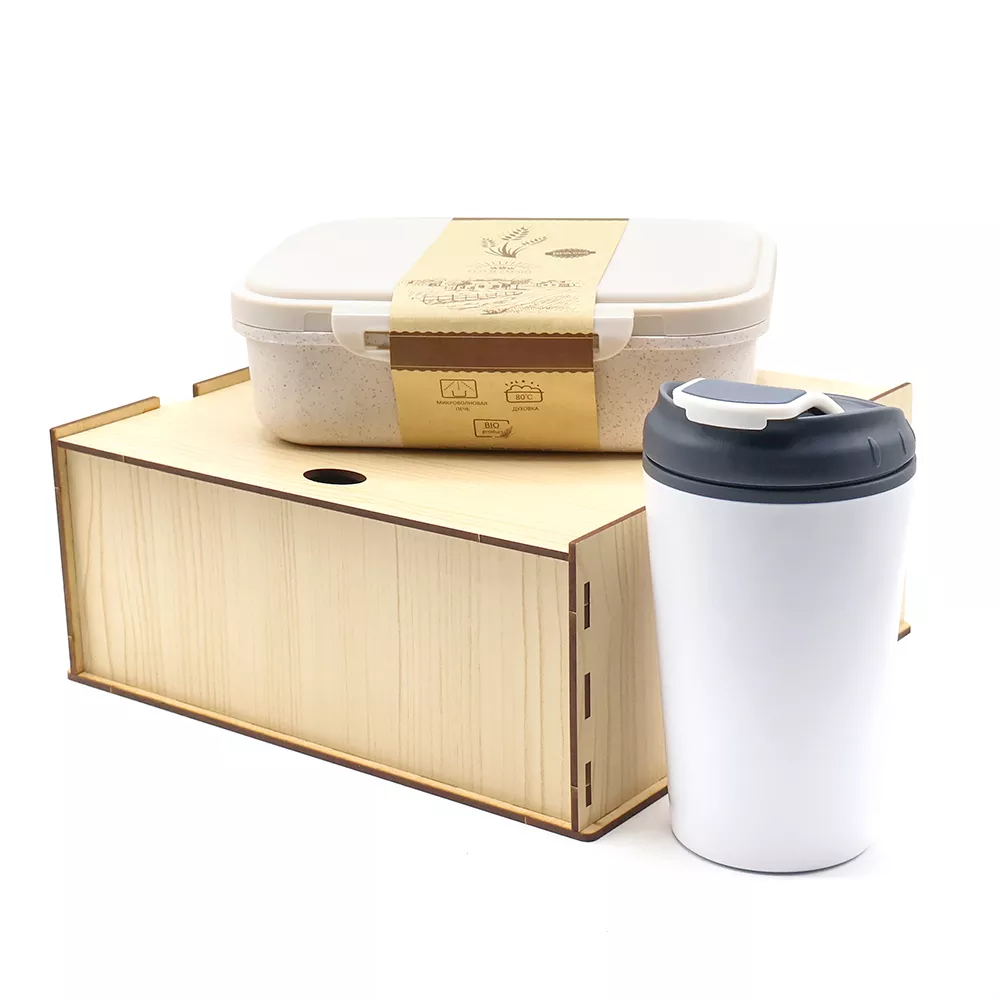 Состав набора: Упаковка из древесноволокнистной плиты - 1 шт. (Артикул: 53063) Ланчбокс (контейнер для еды) Ulf - 1 шт. (Артикул: 13003.13) Термокружка Amor - 1 шт. (Артикул: 5046.01) Наполнитель бумажный 4мм крафт - (Артикул: 00-00080984 )