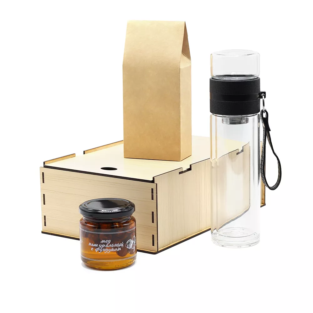 Состав набора: Упаковка из древесноволокнистной плиты - 1 шт. (Артикул: 53059) Бутылка Terra c инфьюзером из боросиликатного закаленного стекла - 1 шт. (Артикул: 14007.02) Мед натуральный с фундуком 240 гр. (Артикул: 1302) Чай зеленый листовой в упаковке (Грузия) 70 гр. (Артикул: 200402) Бумажная стружка (Артикул: 00-00080984)