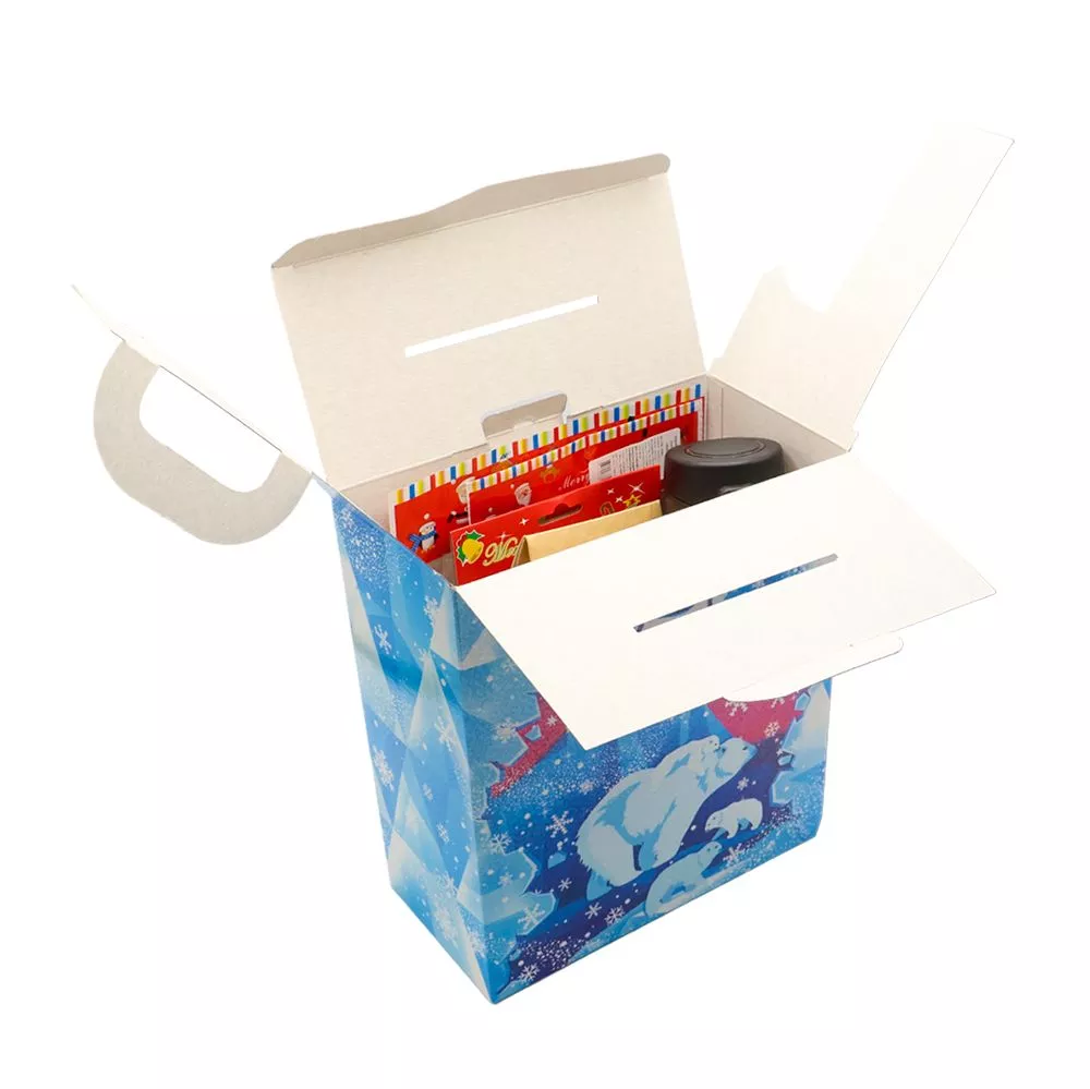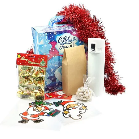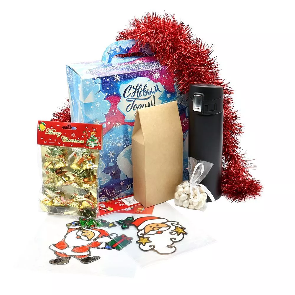 Состав набора: Подарочная коробка УМКА - 1 шт. (Артикул: 53011) Наклейки на окна (пластиковые) (дед мороз 20*25) – 1шт.: (Артикул: SYBXT-292144) Набор пластиковых колокольчиков C Рожеством – 1шт.: (Артикул: SYLD-5120172) Новогодняя мишура (микс) – 1 шт. (Артикул: SYMTA-162002) Наклейки на окна (пластиковые) (дед мороз 15*23) – 1 шт.: (Артикул: SYBXT-292041) Термос Nolita, белый – 1 шт.: (Артикул: 5025.01) Драже "Феерия арахис жемчуг" 50г. – 1 шт.: (Артикул: 250 50) Чай черный крупнолистовой в упаковке (Грузия) 70 г. – 1 шт.: (Артикул: 200401)