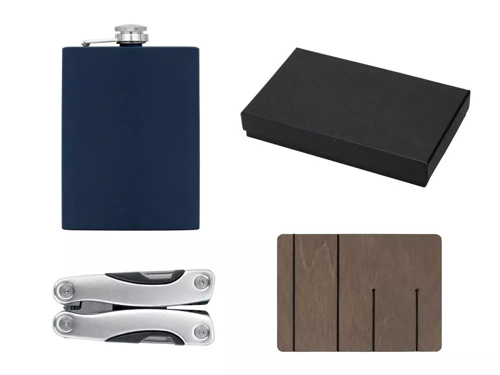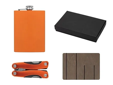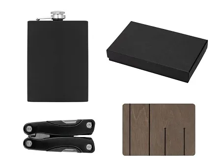 МатериалТовара:Ложемент - фанера, резинка, фляжка - нержавеющая cталь 304 марки с покрытием soft-touch, мультиинструмент - металл, полиэстер, коробка - картон