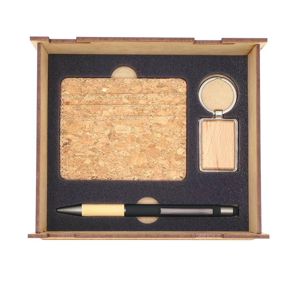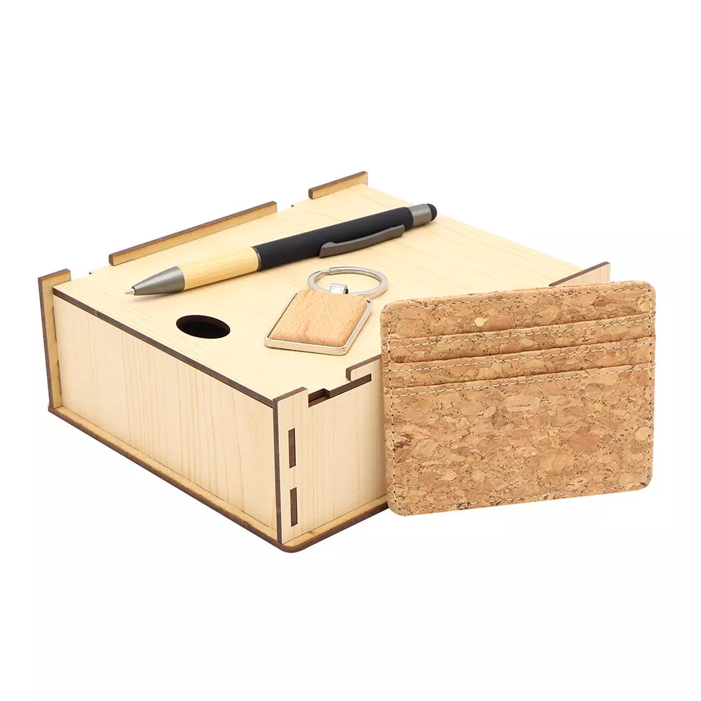 Состав набора: Подарочная коробка ламинированная из HDF 17,5*15,5*6,5 см - 1 шт. (Артикул: 53302) Ложемент см (ручка + Держатель банковских карт + Брелок) - 1 шт. (Артикул 53302.3) Держатель банковских карт Set - 1 шт. (Артикул: 37008.00) Брелок Woody S (прямоугольник) - 1 шт. (Артикул: 12023.19) Ручка металлическая Сайрис софт-тач - 1 шт. (Артикул: 1045.02)