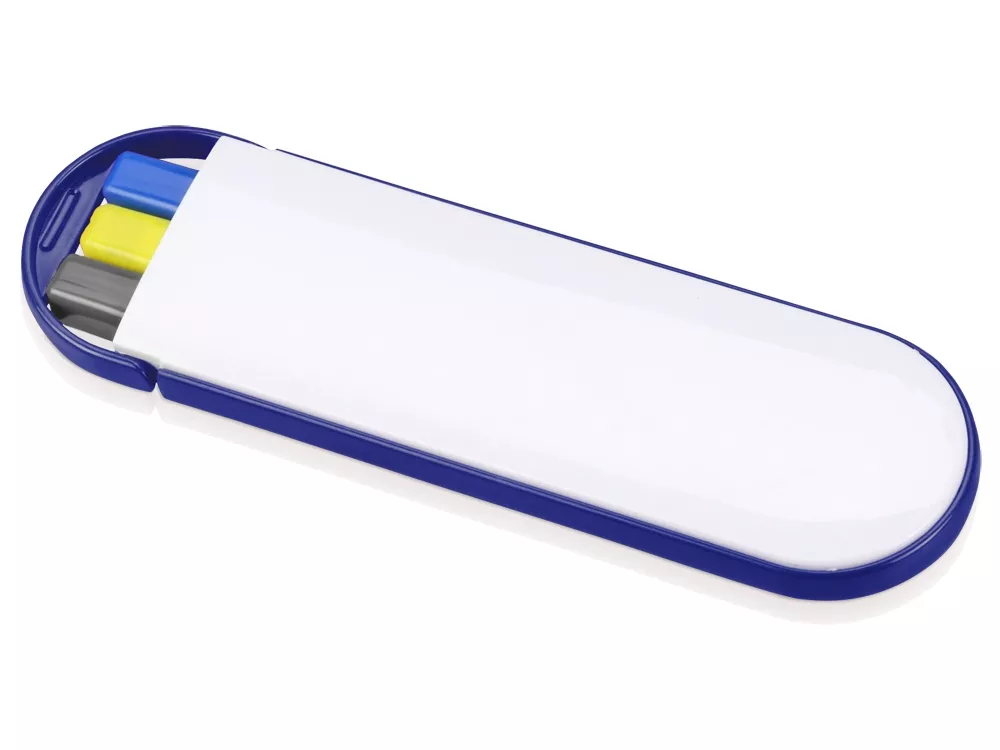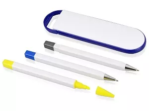 Набор включает в себя шариковую ручку, маркер, карандаш и футляр. Возможность нанесения логотипа на футляр и корпус принадлежностей поможет сделать набор еще ярче.