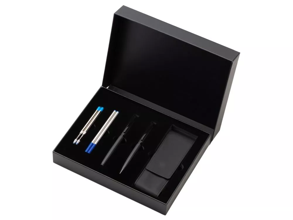 Если вы ищете премиальный и статусный подарок, то этот подарочный набор от бренда Lettertone для вас! Качество видно в каждом элементе. В набор входят шариковая ручка и роллер. Швейцарский пишущий узел Premec и немецкие чернила Dokumental обеспечивают мягкое и плавное письмо. Корпус каждой ручки имеет анодированный слой, благодаря которому гравировка получается с зеркальным эффектом.В набор входит также пенал для двух ручек, который также можно брендировать. - по 2 запасных стержня для каждой ручки в комплекте; - цвет чернил: синий; - набор упакован в подарочную коробку. Цифровая печать (наклейка на белой пленке) на данный товар осуществляется бесплатно. Оплачивается только настройка оборудования в размере 1100 рублей на весь тираж.