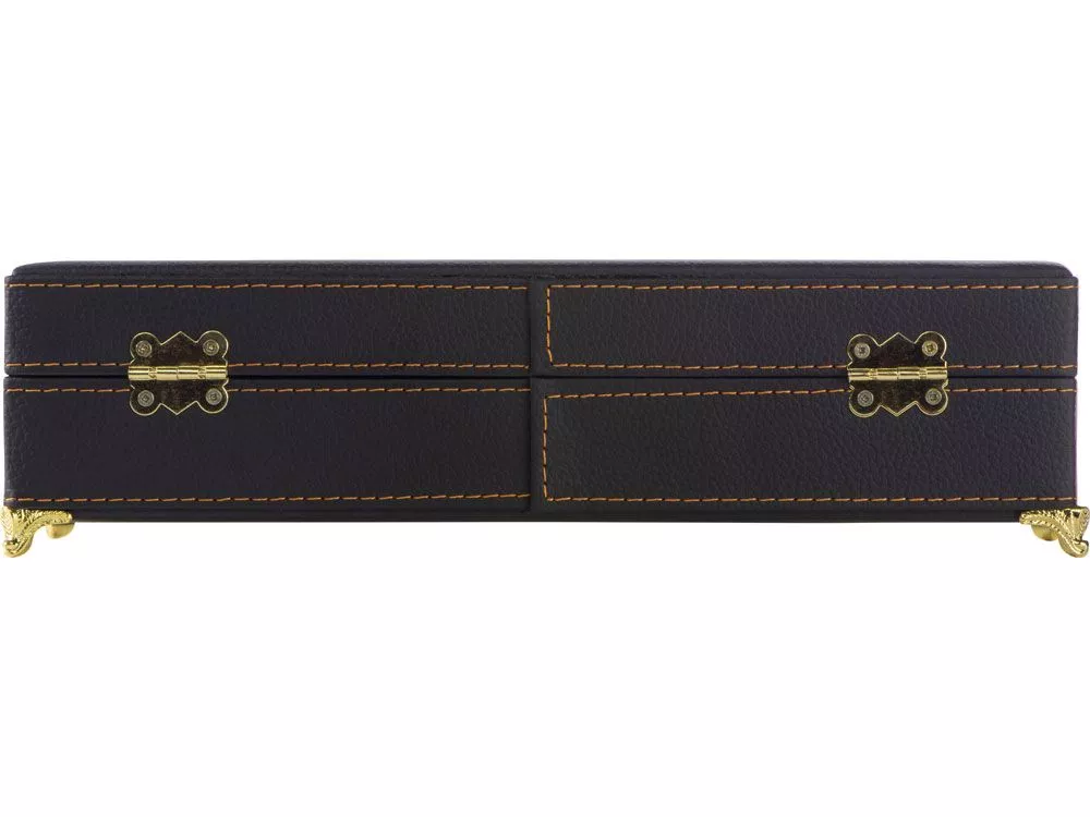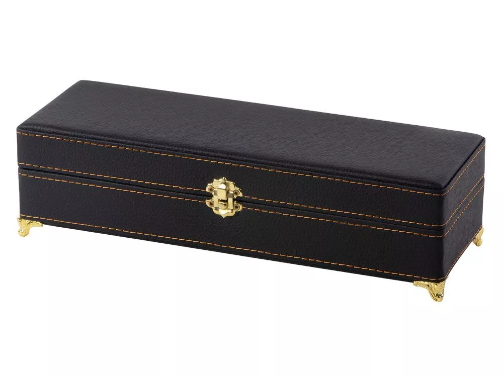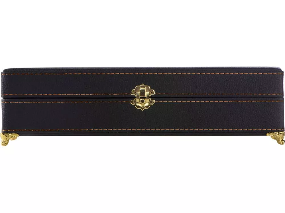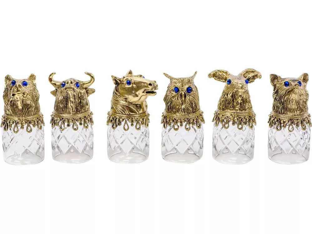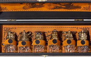 Футляр из эко-кожи, внутренняя отделка натуральная кожа рыжего цвета. Рисунок нанесен путем термообработки. В набор входит шесть стопок по 30 мл. Хрусталь, литьё.