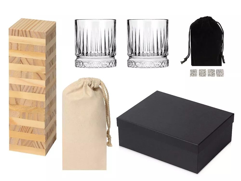 Подарочный набор с бокалами, камнями для виски и дженгой. Набор отлично подойдёт для приятного отдыха с друзьями за весёлой игрой. Популярная настольная игра Tower 54 состоит из 54 брусков, выполненных из древесины сосны. Задача участников состоит в том, чтобы по очереди доставать блоки из основания и перекладывать их в верхнюю часть башни. Захватывающая игра, каждая партия которой будет уникальна, может проводится как в кооперативном режиме, так и в индивидуальном. Камни для виски не тают, в отличие от льда, а также охлаждают напиток в течение более длительного времени. Камни подойдут и для любого другого напитка. Поставляются в бархатном мешочке на завязках, на который можно нанести логотип компании. В наборе 4 шт. Толстое дно стеклянного бокала препятствует быстрому нагреванию. Рельеф напоминает огранку драгоценного камня и особенно эффектно проявляется, когда бокал заполнен. - игра упакована в собственный хлопковый мешочек; - бокалы можно мыть в посудомоечной машине; - классический объём бокала 210 мл; - подарочная коробка с наполнителем входит в набор. Трафаретная печать (1 цвет (цветные изделия)) на данный товар осуществляется бесплатно. Оплачивается только настройка оборудования в размере 10000 рублей на весь тираж.