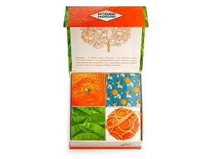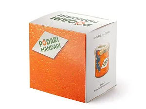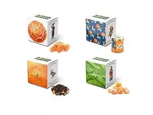 Гастрономический подарочный набор ПодариМандари. Набор представляет собой метафору мандарина – одного из главных символов Нового года. Состоит из 4 продуктов: – чай с цедрой, сегментами и цветами апельсина; – мармелад из мандаринов; – цукаты из кумквата; – цитрусовые леденцы. Продукты упакованы в небольшие картонные коробочки размером 70 х 70 х 55 мм и помещены в шкатулку из переплётного картона с магнитным клапаном. Состав: Кумкват: кумкват, сахар, Е220. Мармелад: сахар, мандариновое пюре, патока, лимонная кислота, пектин. Чай: чай черный байховый, лепестки календулы, ягоды облепихи, имбирь, кусочки апельсина, шелковица. Леденцы: патока, вода, регуляторы кислотности (лимонная кислота, молочная кислота), ароматизаторы, идентичные натуральным, краситель: аннато, сахар.