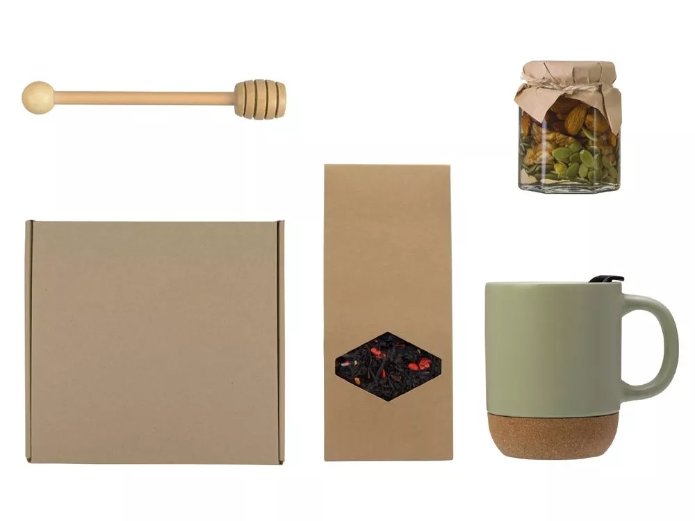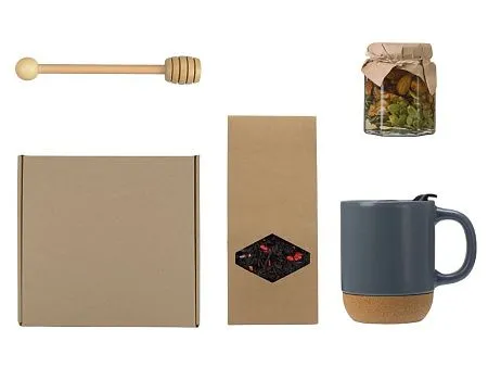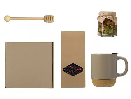 МатериалТовара:Кружка - керамика, пробка, мед в банке - стекло, ложка - бамбук, чай - крафт-коробка, коробка - картон