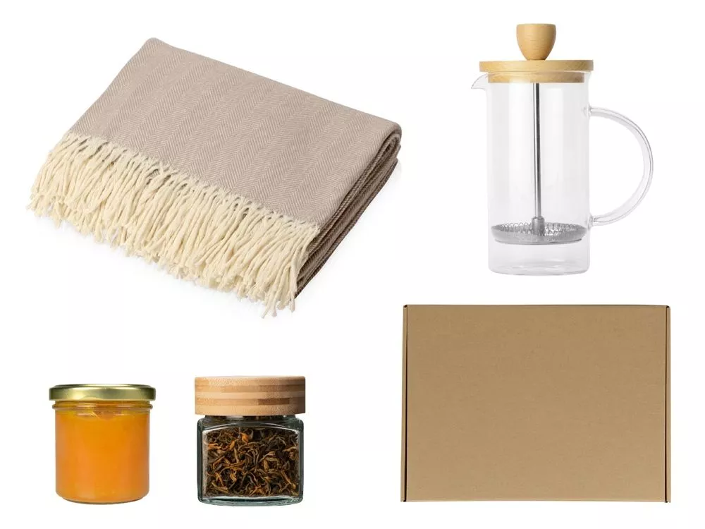Подарочный набор с пледом, френчпрессом, чаем и вареньем