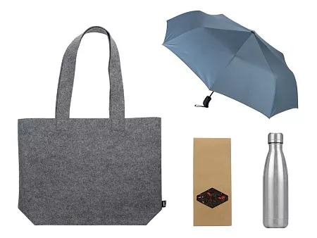 МатериалТовара:Купол - 190Т эпонж из RPET, каркас - сталь, спицы – стекловолокно, термобутылка - нержавеющая сталь, шоппер - 100% RPET полиэстер