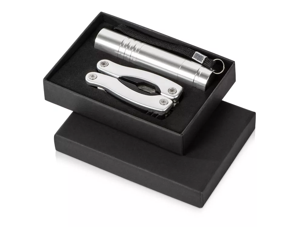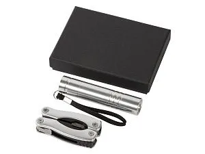 Подарочный набор Scout с многофункциональным ножом и фонариком. 11-тифункциональный инструмент с диодным фонариком упакован в черную картонную коробку. Батарейка в комплекте. Алюминий. Гравировка (оптоволоконный лазер) (Без чернения) на данный товар осуществляется бесплатно. Оплачивается только настройка оборудования в размере 1000 рублей на весь тираж.