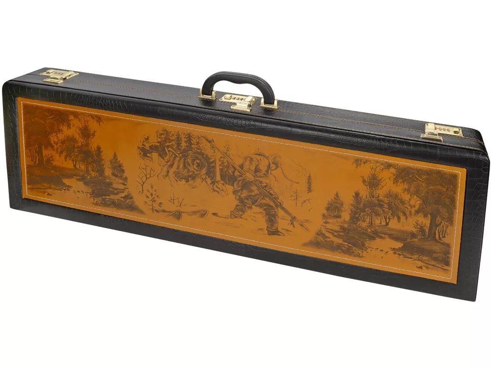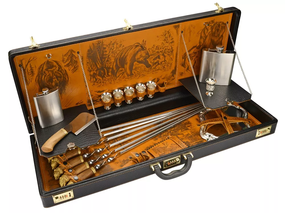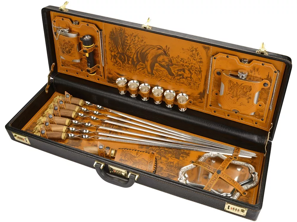 Кейс из сплит-кожи, с повышенной износостойкостью, внутренняя отделка натуральная кожа с художественным выжиганием В комплект входит: Фляга 240мл (нерж.сталь)– 1шт. Фляга 480мл (нерж.сталь)- 1шт. Стопка 40мл (нейзильбер)- 6шт. Фонарик- 1шт. Поднос (нейзильбер)- 6шт. Нож разделочный (нерж. сталь) 45х13, рукоять орех, бронзовое литье– 1 шт. Шампура 810 мм (нерж. сталь) ручка орех, бронзовое литье– 6 шт.