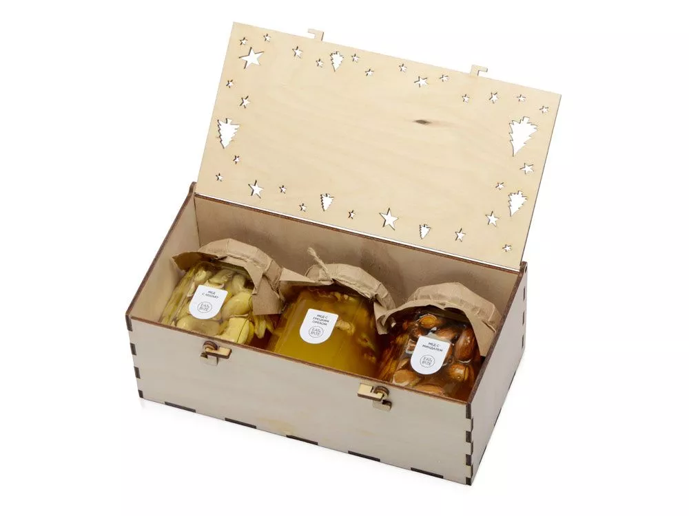 Набор состоит из трёх баночек мёда с орехами: с кешью, миндалём и грецким орехом. Набор упакован в подарочную деревянную коробку. Гравировка (CO2 лазер) (Без чернения) на данный товар осуществляется бесплатно. Оплачивается только настройка оборудования в размере 950 рублей на весь тираж.