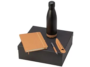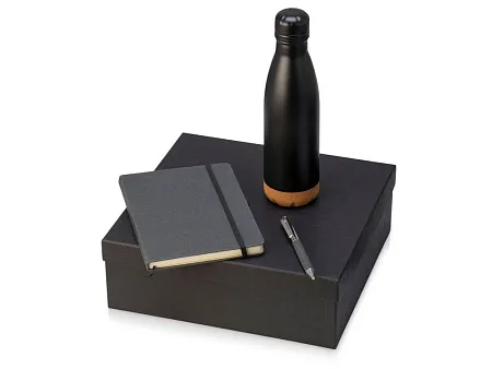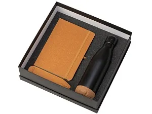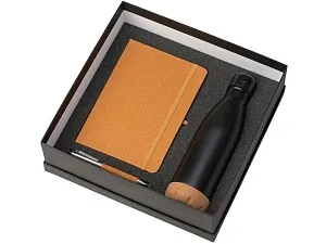 Набор из блокнота, ручки и бутылки для воды - идеальный вариант для подарка сотрудникам или клиентам. Термобутылка имеет медный слой между стенками, который позволяет ей удерживать температуру до 24 часов. Нижняя часть бутылки выполнена из экологичной пробки, которая не даёт скользить по столу или царапать его. Блок блокнота - бежевого цвета с линовкой в линейку. Твёрдая обложка выполнена из переработанной кожи, как и вставка на ручке. Ручка изготовлена из переработанной стали и оснащена стержнем с эко-чернилами, при производстве которых не выделяется вредных веществ. объём термобутылки: 460 мл; блокнот с резинкой; мерч с заботой об экологии. Трафаретная печать (1 цвет (цветные изделия)) на данный товар осуществляется бесплатно. Оплачивается только настройка оборудования в размере 10000 рублей на весь тираж.