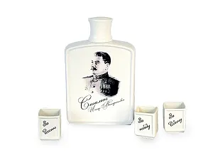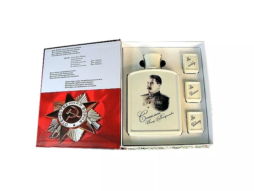 День Победы - один из самых важных и памятных государственных праздников в нашей стране. В этот знаковый для России день принято дарить памятные сувениры. Подарочная книга День Победы - это великолепный подарок на 9 мая, который запомнится надолго. Подарочный набор стилизован под книгу и состоит из штофы с изображением генералиссимуса И. В. Сталина и трех рюмок с патриотическими тостами За Россию”, За Родину”, За победу”. Все сувениры выполнены из высококачественной керамики, поэтому они еще долго будут служить и радовать глаз. Этот подарочный набор станет прекрасным дополнением к праздничному столу.