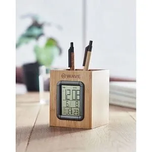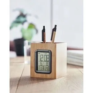 Подставка для ручек бамбуковая с встроенным дисплеем , отображающим календарь, будильник и термометр. В комплект входят 2 элемента питания.
