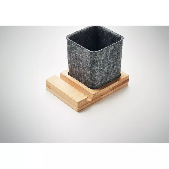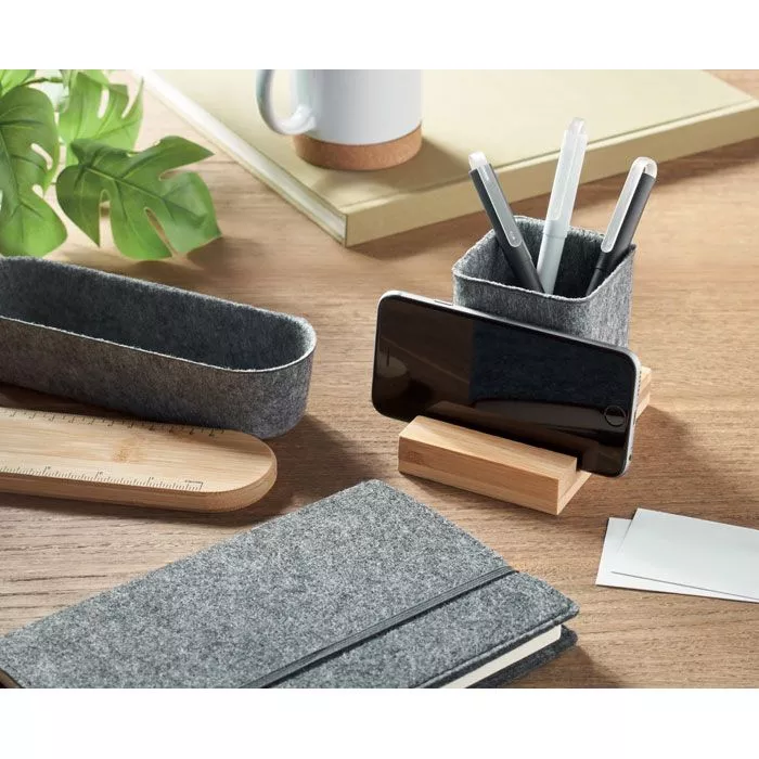Фетровый пенал RPET с бамбуковым основанием и держателем для телефона.