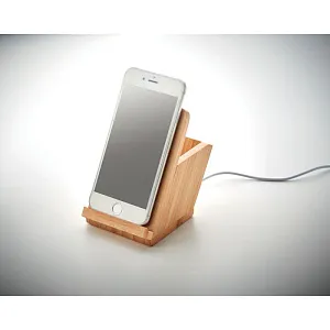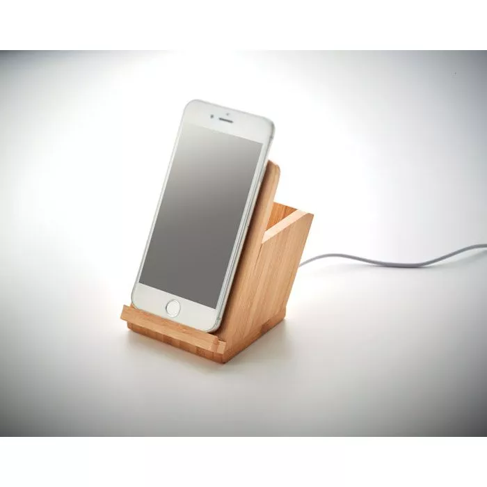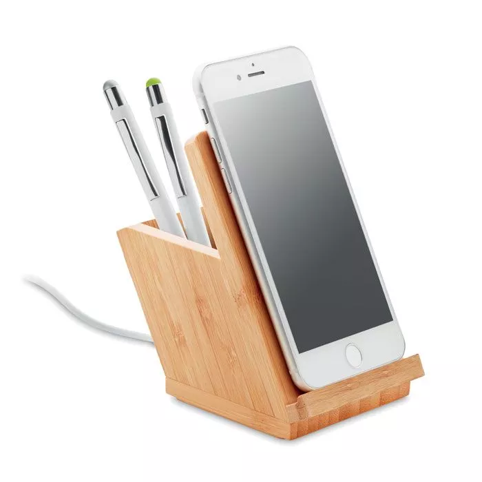 Беспроводное зарядное устройство в бамбуковом корпусе в форме настольной подставки для ручек. Выход: DC5V / 1.0A. Совместим с последними версиями Android, iPhone® 8, X и новее. Бамбук является натуральным продуктом, могут быть небольшие различия в цвете