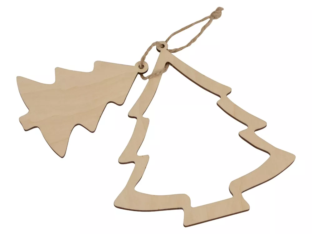 Оригинальное елочное украшение в виде двух новогодних елочек, скрепленных вместе. Подвеска выполнена из березовой фанеры. Большая зона для нанесения. Гравировка (Без чернения) на данный товар осуществляется бесплатно. Оплачивается только настройка оборудования в размере 500 рублей на весь тираж.