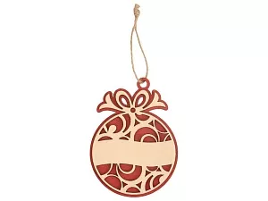 Оригинальное елочное украшение в виде ажурного новогоднего шара выполнено из березовой фанеры и тонировано в красный цвет. Поле для нанесения – широкая лента, обхватывающая шар, на которой ваши пожелания или логотип будут смотреться как нельзя уместно, органично вписываясь в облик изделия.