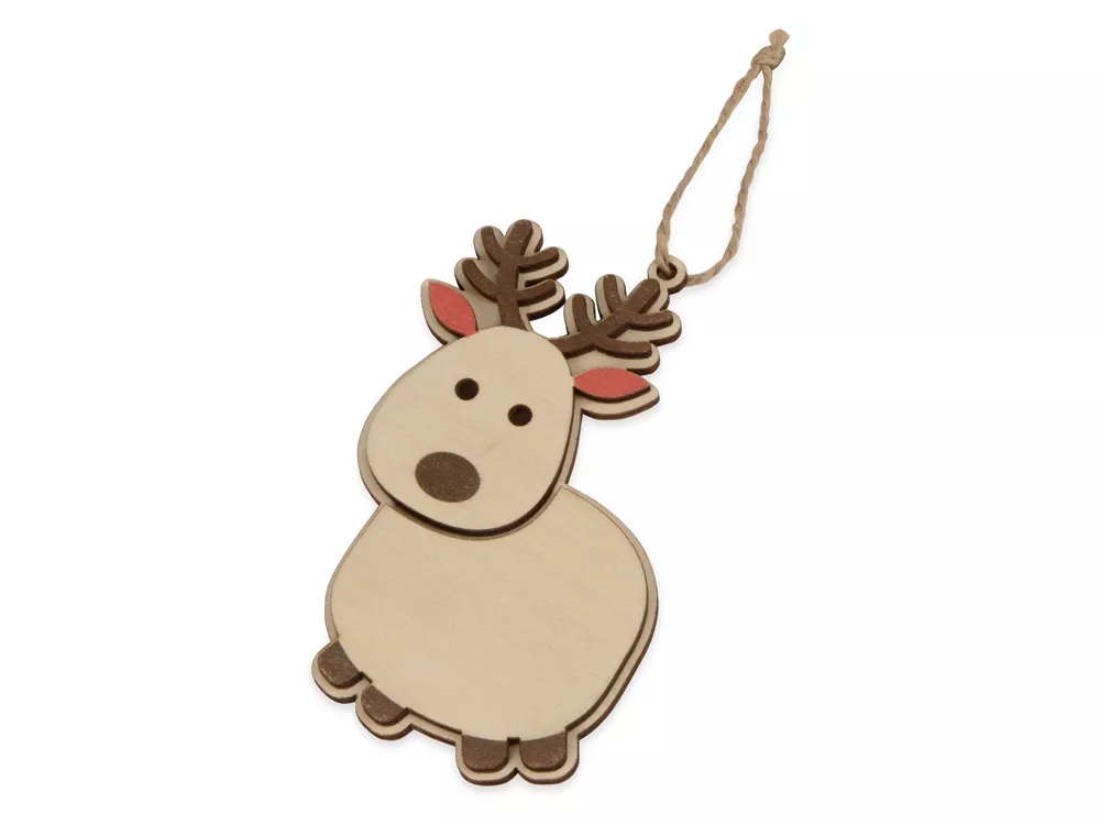 Елочная игрушка в виде праздничного символа - новогоднего оленя. Изготовлен из нескольких слоев березовой фанеры и украшен тонировкой. Гравировка (Без чернения) на данный товар осуществляется бесплатно. Оплачивается только настройка оборудования в размере 500 рублей на весь тираж.