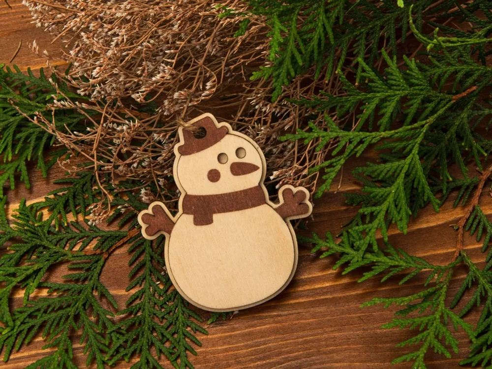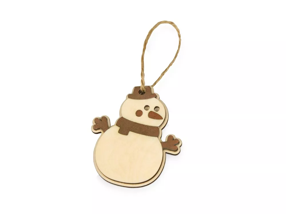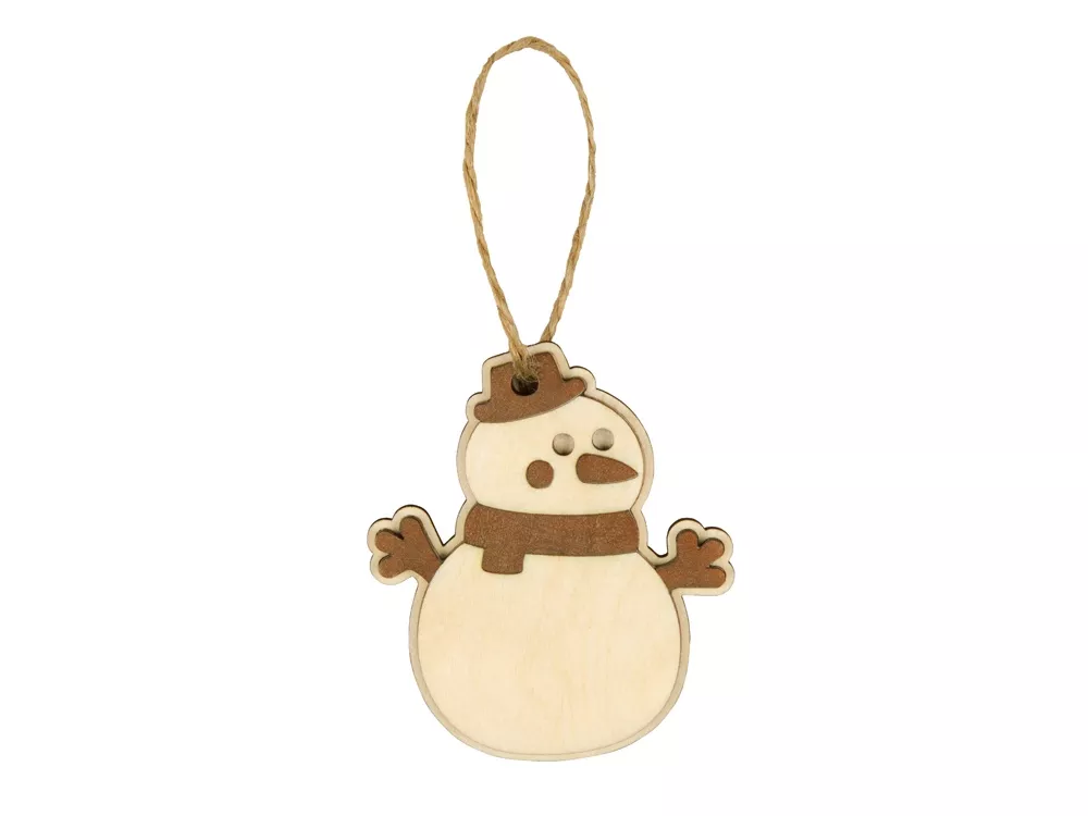 Оригинальное елочное украшение в виде снеговика. Подвеска выполнена из березовой фанеры и тонирована в коричневый цвет. Это елочное украшение – отличный вариант для экоелки. Не хотите использовать елочные игрушки из пластика или стекла? Деревянные сувениры из нашего каталога станут отличным украшением, которые создадут атмосферу уюта в вашем доме.