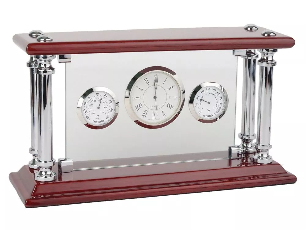 Отличный статусный подарок для руководителя или партнера компании – погодная станция, совмещающая в себе часы, гигрометр и термометр. Благородное сочетание дерева, металла и стекла не оставит равнодушным даже очень избирательного человека. Гравировка (оптоволоконный лазер) (Без чернения) на данный товар осуществляется бесплатно. Оплачивается только настройка оборудования в размере 950 рублей на весь тираж.
