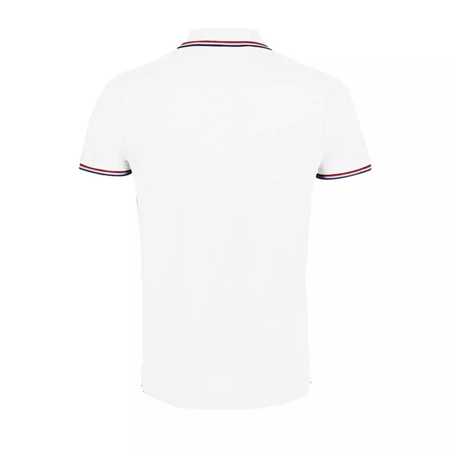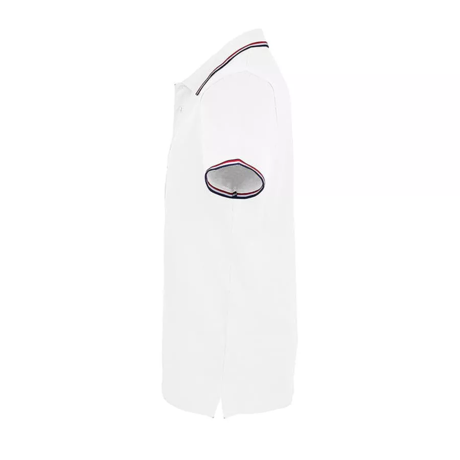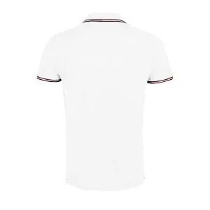 Мужская футболка поло с боковыми швами. Воротник и манжеты вывязаны резинкой 1*1 Контрастные полоски на воротнике, по низу рукавов, внутри бокового разреза и на внутренней стороне воротника. Планка поло на двух пуговицах. Лейбл с размером находится во шве горловины, лейбл производителя вшит в в боковом шве изнутри.