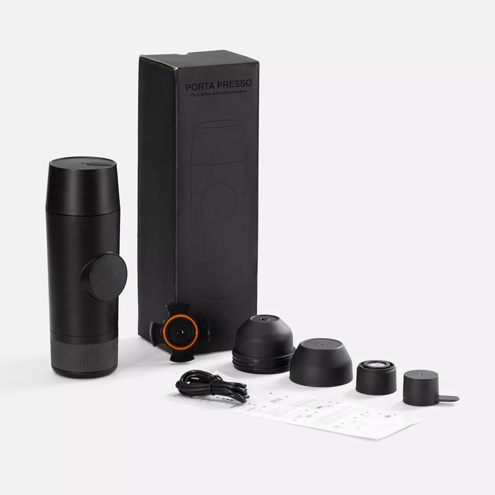 Портативная и компактная кофемашина Porta Presso с легкостью помещается в сумку, работает без розетки от встроенного аккумулятора и приготовит отличный эспрессо, где угодно: дома, на работе, в походе или на прогулке. Все, что потребуется для приготовления ароматного и свежего напитка, — это кипяток 85°С и кофе: молотый или в капсулах.