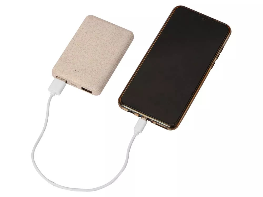 Портативное зарядное устройство Wheatty на 35% состоит из переработанной пшеничной соломы, что является положительным примером сокращения производства и потребления пластика в мире. Повербанк имеет миниатюрный размер и небольшой вес. Может заряжать два устройства одновременно. Поставляется в крафт упаковке из переработанной бумаги Тампопечать (1 цвет (цветные изделия)) на данный товар осуществляется бесплатно. Оплачивается только настройка оборудования в размере 2300 рублей на весь тираж.
