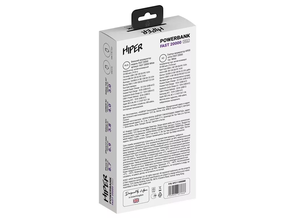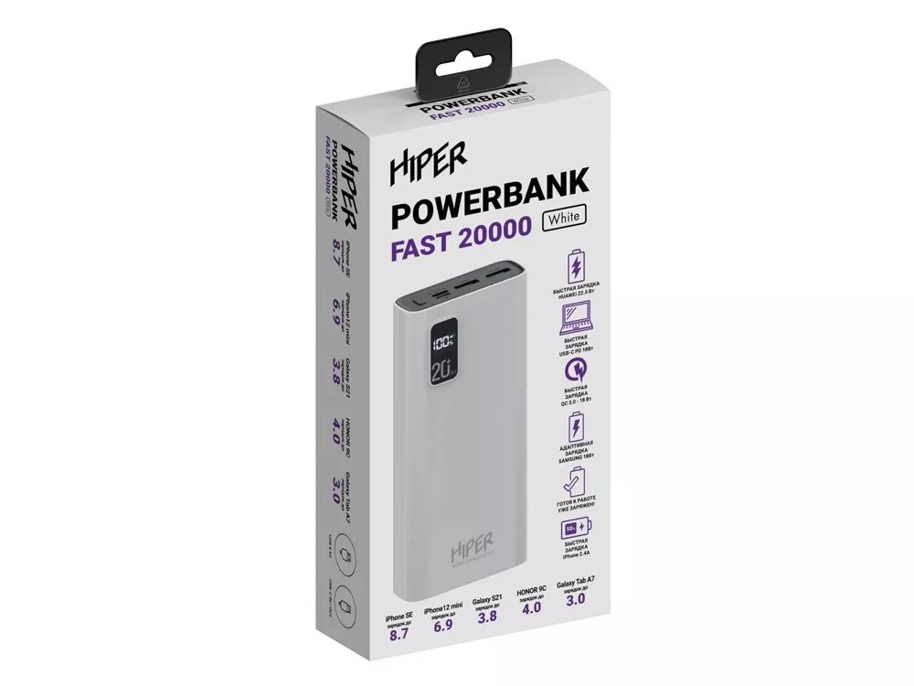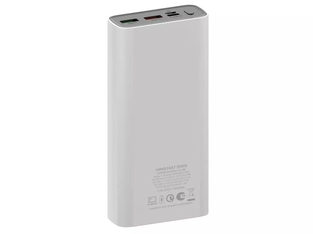 Портативный внешний аккумулятор HIPER FAST 20000 емкостью 20000 мАч (74Втч) оснащён двунаправленным портом USB-C, Micro-USB входом для зарядки, с поддержкой быстрой зарядки аккумулятора QC и PD, 2xUSB-A выходами, максимальный выходной ток 5А, максимальная мощность 22,5 Вт, поддержка быстрой зарядки стандарта QC 18 Вт, поддержка быстрой зарядки стандарта PD 18 Вт, стильный дизайн. Тампопечать (1 цвет (белые изделия)) на данный товар осуществляется бесплатно. Оплачивается только настройка оборудования в размере 3600 рублей на весь тираж.