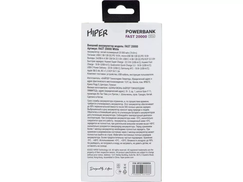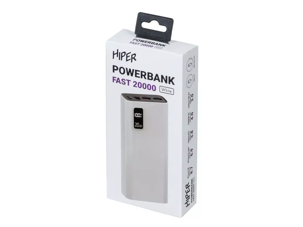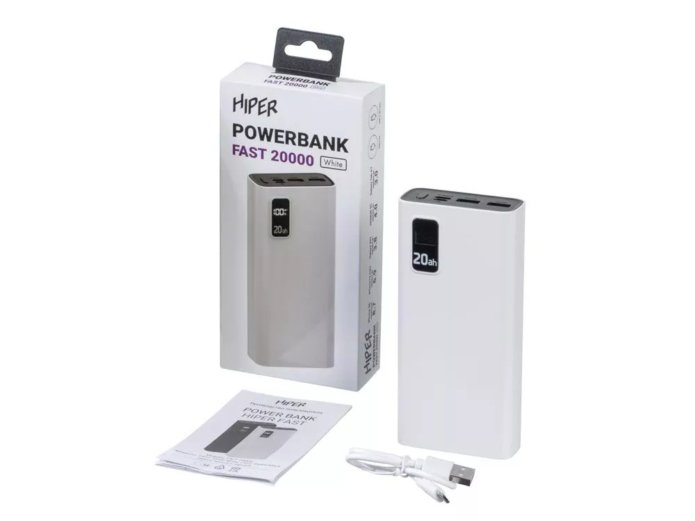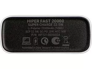 Портативный внешний аккумулятор HIPER FAST 20000 емкостью 20000 мАч (74Втч) оснащён двунаправленным портом USB-C, Micro-USB входом для зарядки, с поддержкой быстрой зарядки аккумулятора QC и PD, 2xUSB-A выходами, максимальный выходной ток 5А, максимальная мощность 22,5 Вт, поддержка быстрой зарядки стандарта QC 18 Вт, поддержка быстрой зарядки стандарта PD 18 Вт, стильный дизайн.