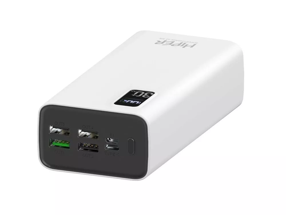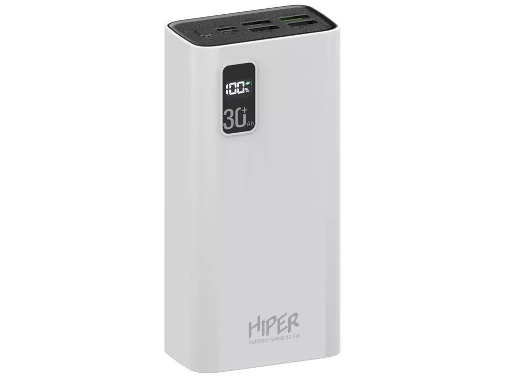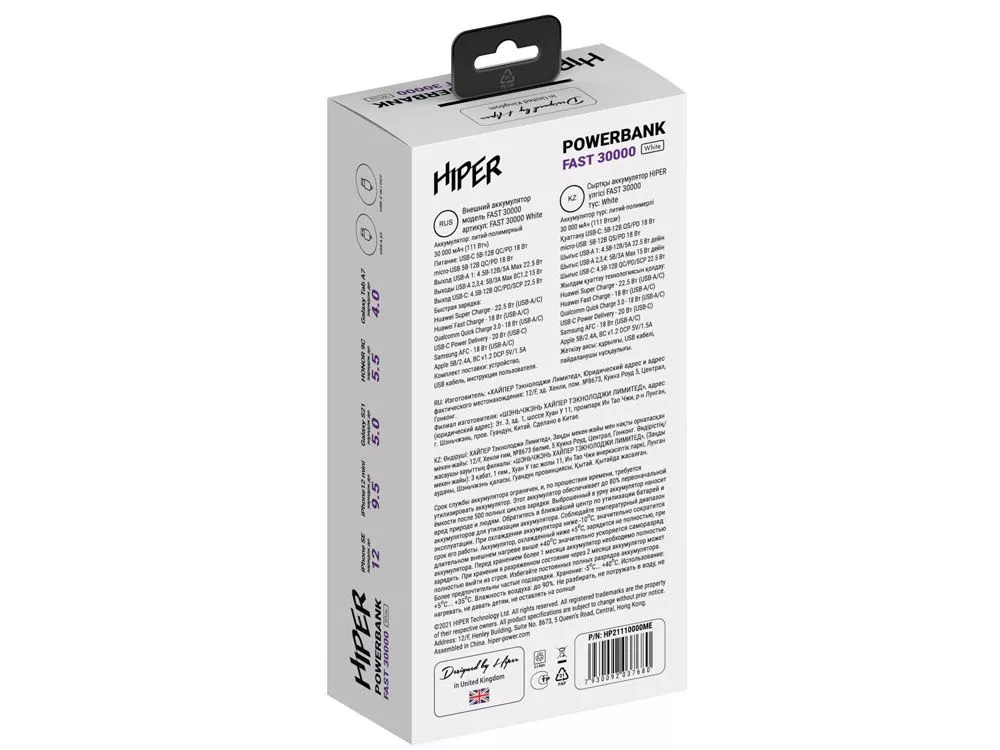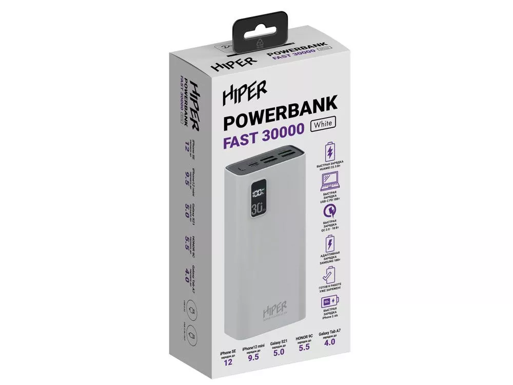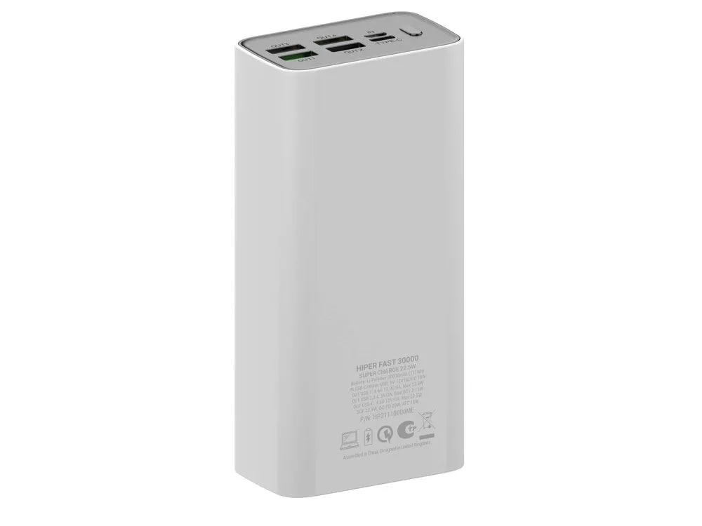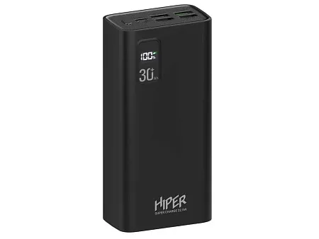 Портативный внешний аккумулятор HIPER FAST 30000 емкостью 30000 мАч (111Втч) оснащён двунаправленным портом USB-C, Micro-USB входом для зарядки, с поддержкой быстрой зарядки аккумулятора QC и PD, 4xUSB-A выходами, максимальный выходной ток 5А, максимальная мощность 22,5 Вт, поддержка быстрой зарядки стандарта QC 18 Вт, поддержка быстрой зарядки стандарта PD 18 Вт, стильный дизайн. Тампопечать (1 цвет (белые изделия)) на данный товар осуществляется бесплатно. Оплачивается только настройка оборудования в размере 3600 рублей на весь тираж.