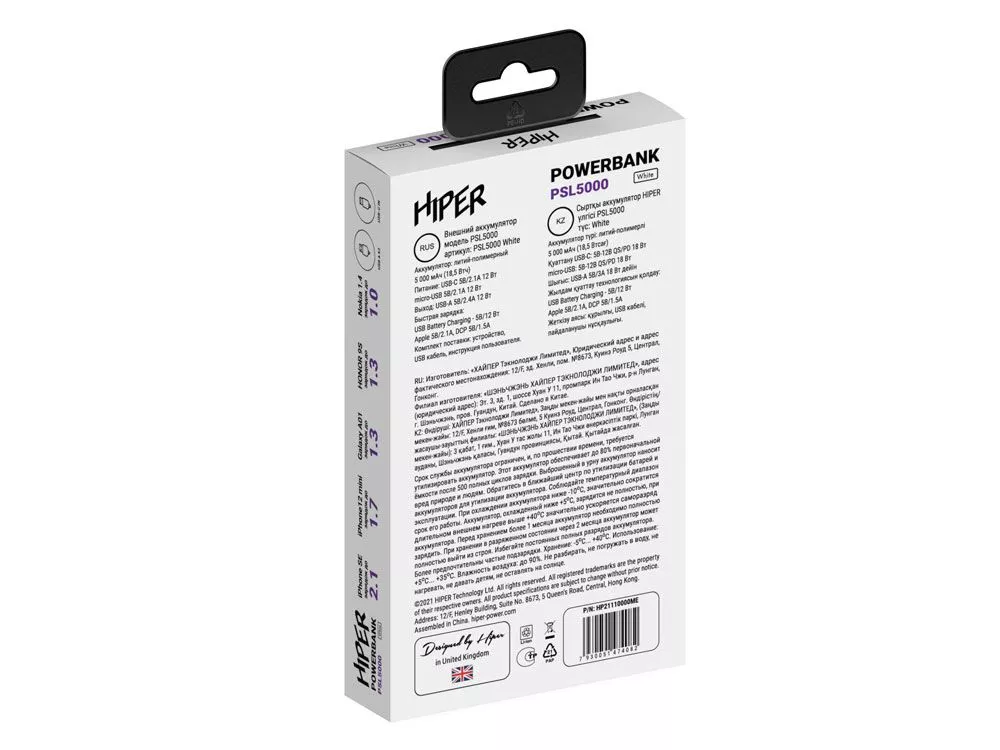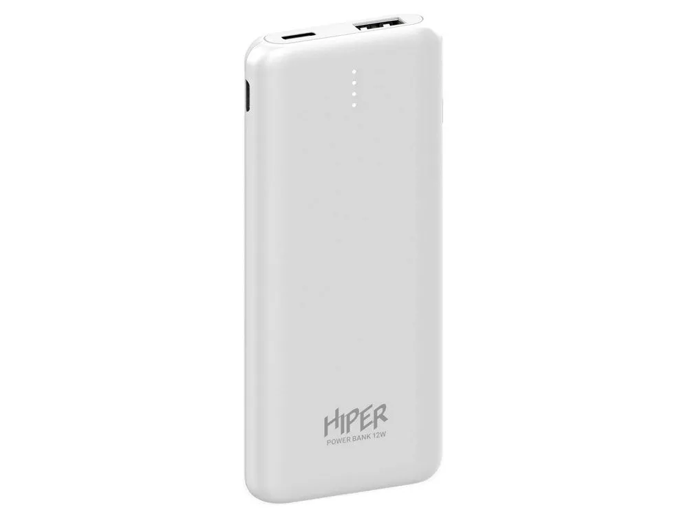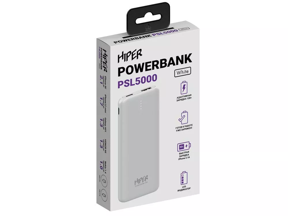 Портативный внешний литий-ион полимерный аккумулятор HIPER PSL5000 White емкостью 5000 мАч (18,5Втч) оснащён входом USB-C для зарядки, Micro-USB входом для зарядки, 2xUSB-A выходами, максимальный выходной ток 2,1А, максимальная мощность 12 Вт, тонкий корпус.