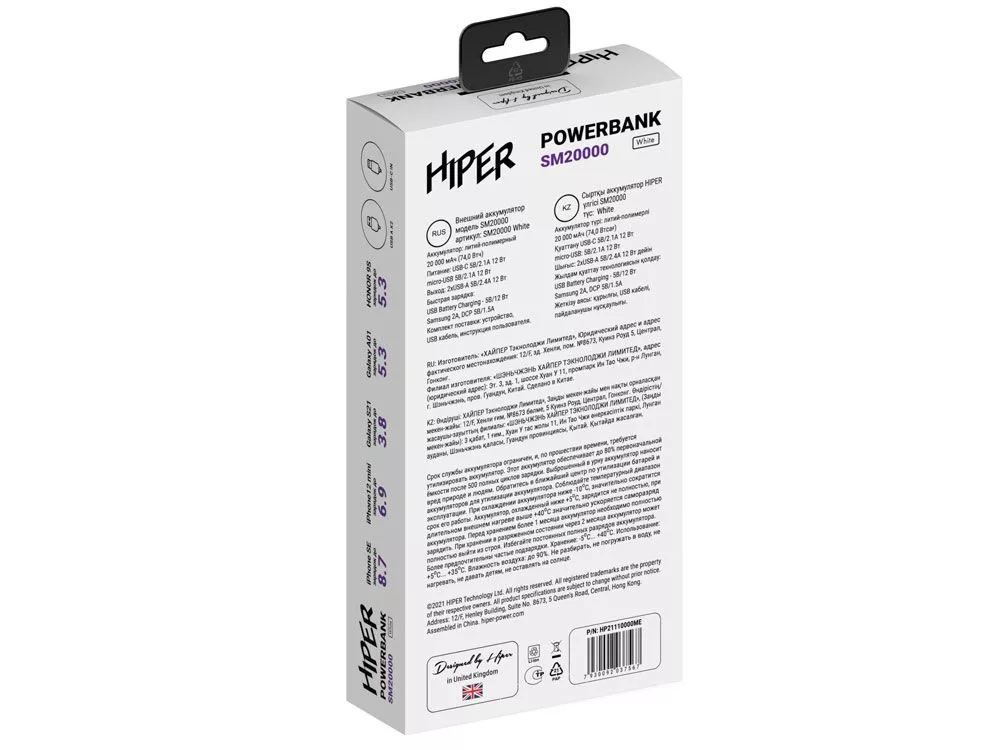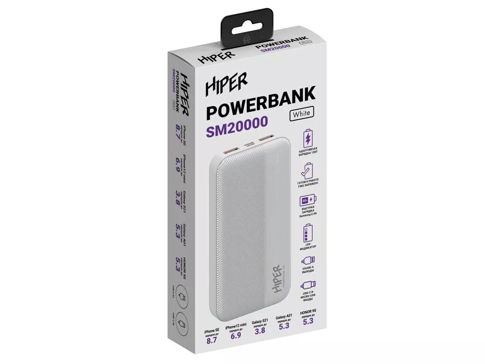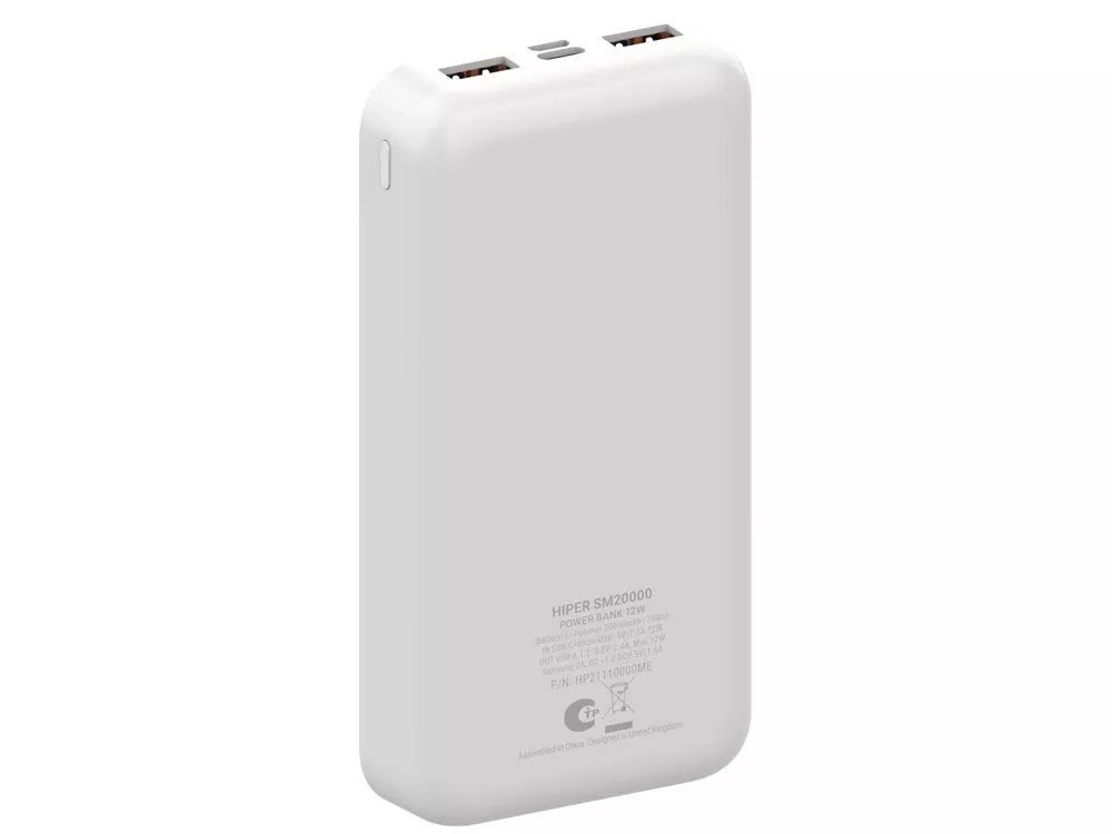 Портативный внешний аккумулятор HIPER SM20000 емкостью 20000 мАч (74Втч) оснащён входом USB-C для зарядки, Micro-USB входом для зарядки, 2xUSB-A выходами, максимальный выходной ток 2,1А, максимальная мощность 12 Вт. Тампопечать (1 цвет (белые изделия)) на данный товар осуществляется бесплатно. Оплачивается только настройка оборудования в размере 3600 рублей на весь тираж.