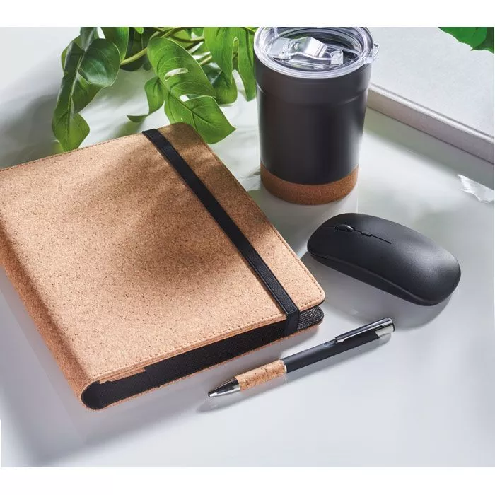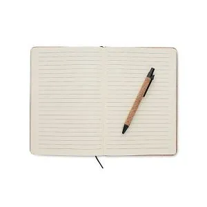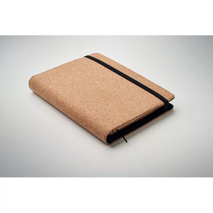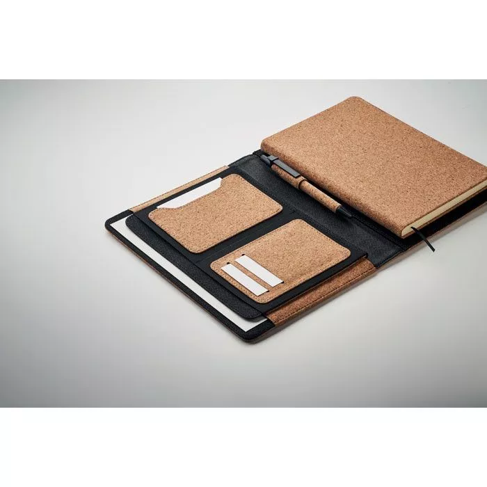 Пробковый портфель формата А5. Многоразовая записная книжка формата А5 с твердой пробковой обложкой. В переплете. 192 линованные страницы из переработанной бумаги (96 листов). Подходящая ручка и держатель для ручки. 2 держателя для карточек и одно большое отделение. Эластичный ремешок с застежкой.