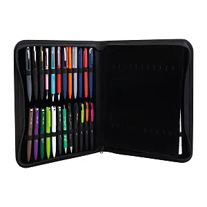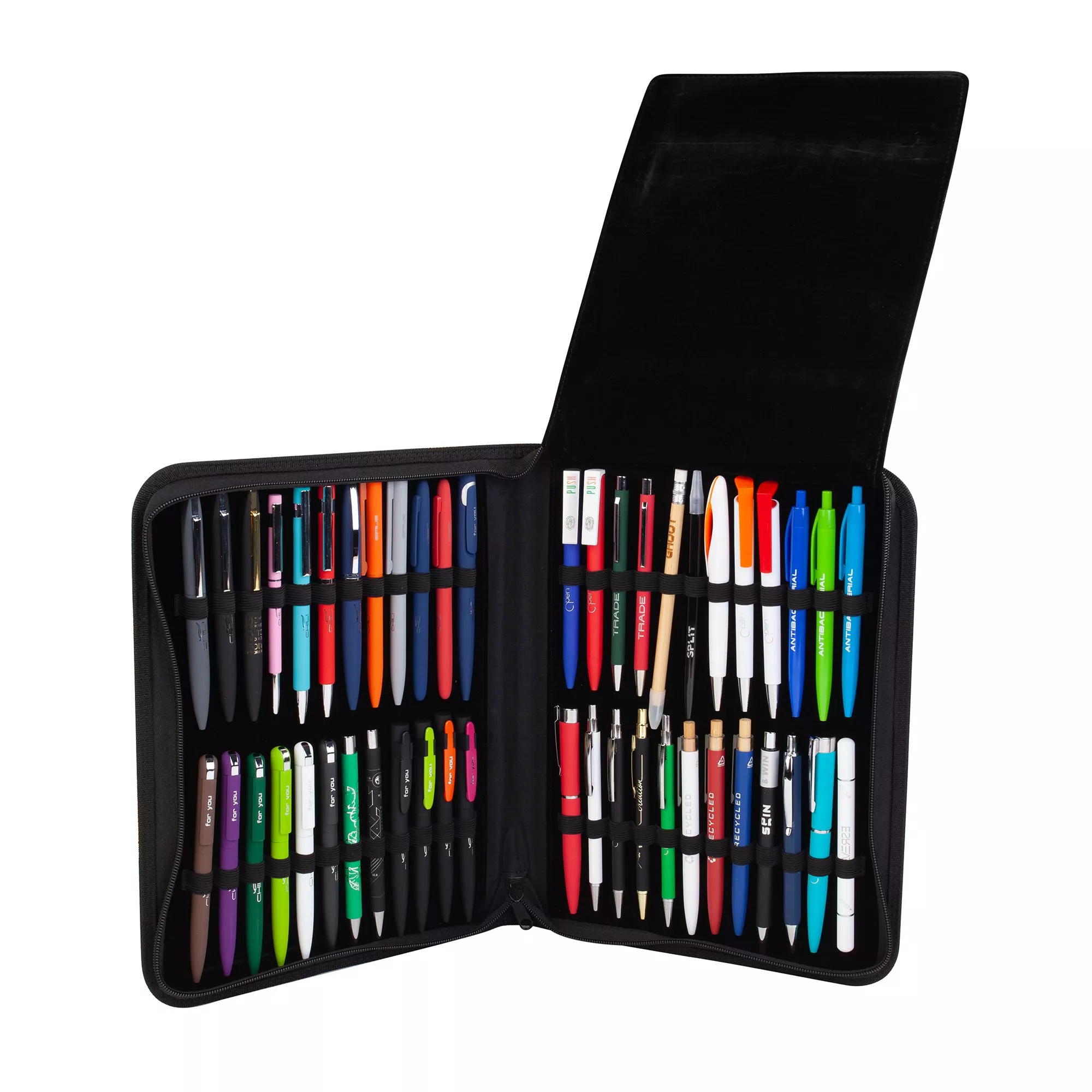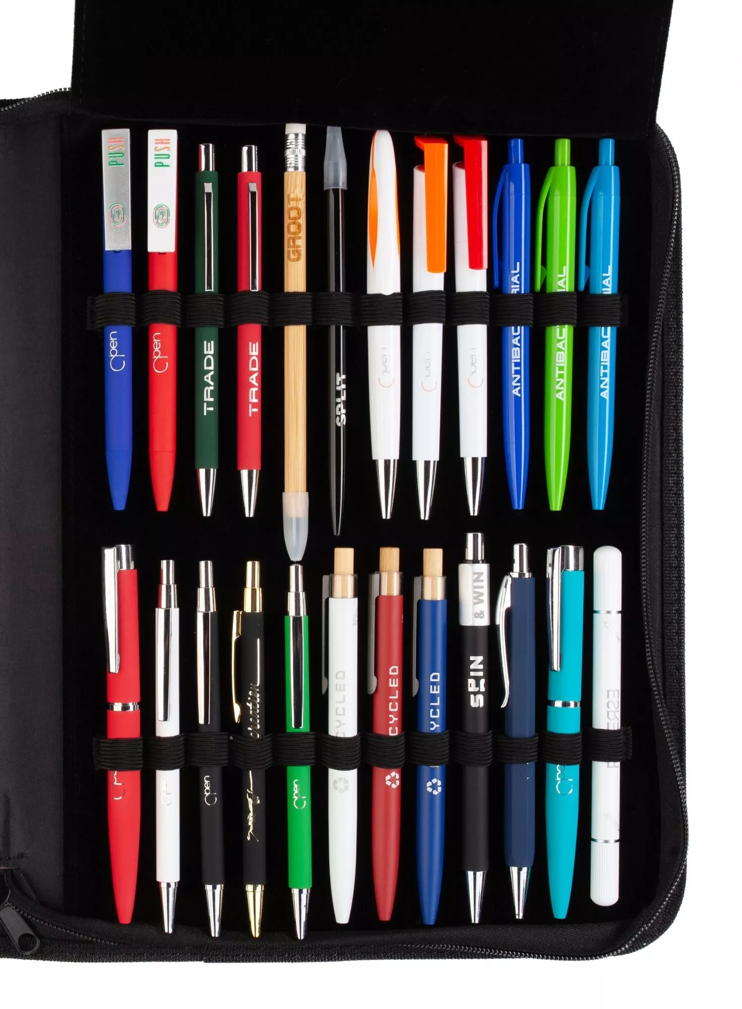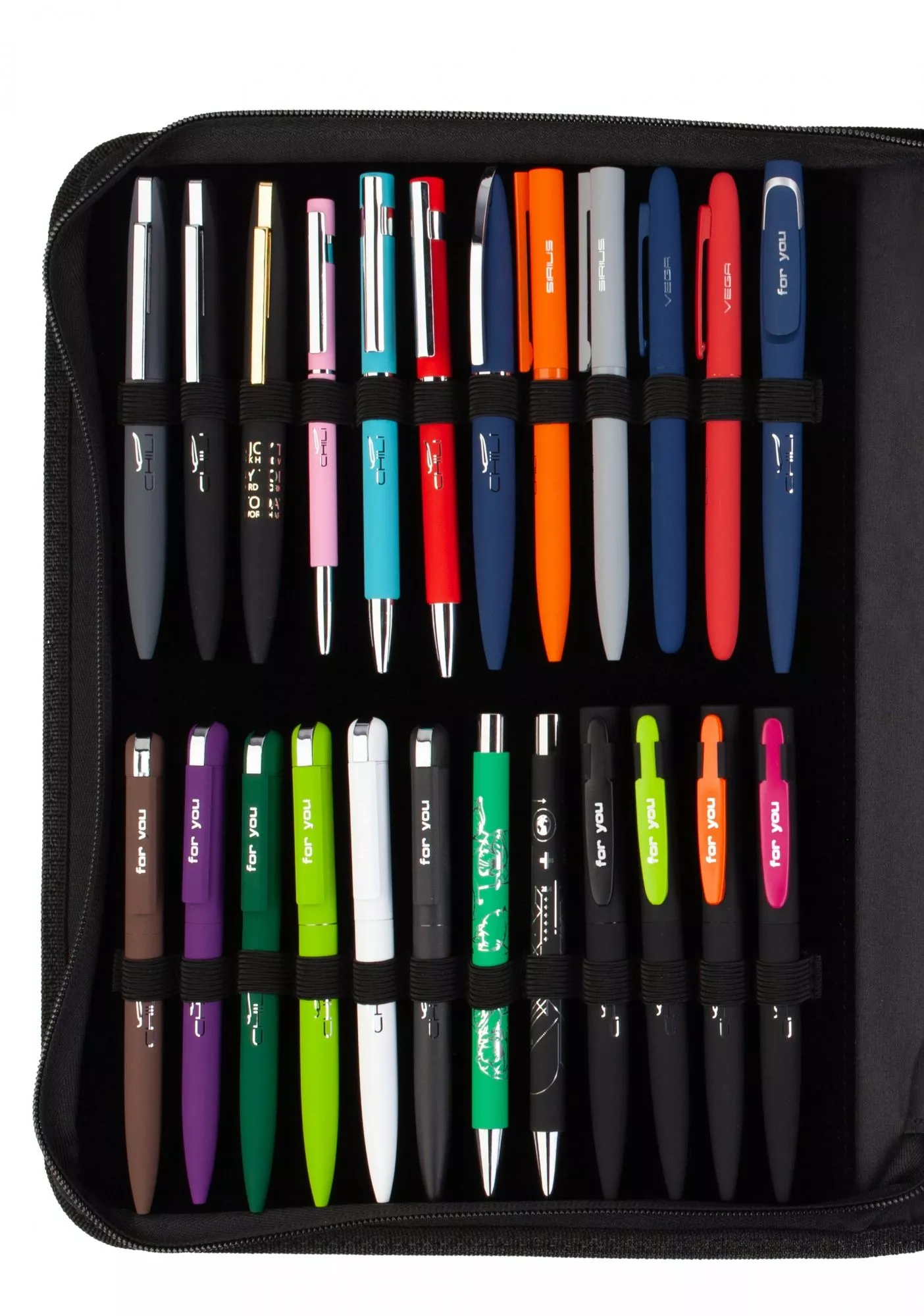 Презентационный кейс на 48 ручек и карандашей с разнообразными видами нанесения, включая зеркальную гравировку, гравировку по металлу и бамбуку, тампопечать, 3D-УФпечать.