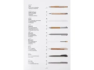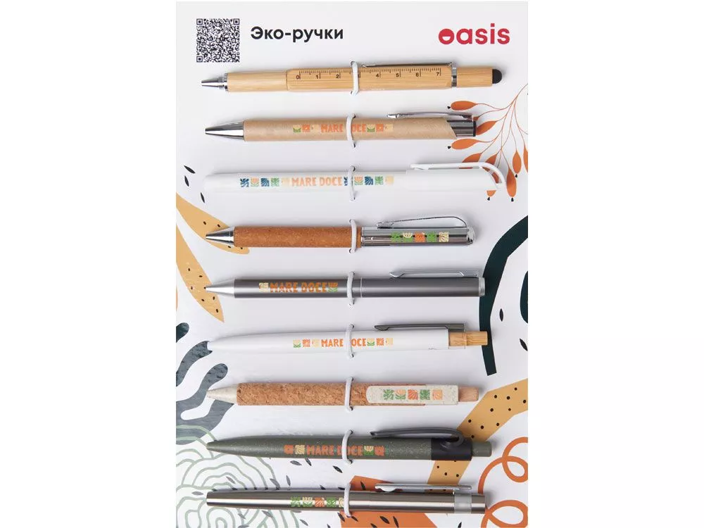 Промо-сет ЭКО ручек — это презентационный комплект, включающий 9 уникальных моделей с несколькими вариантами нанесения: УФ-печать, тампопечать. В сете представлены самые хитовые позиции категории ЭКО, а также новинки каталога периода зима-весна 2026 года. Все образцы аккуратно закреплены на стильной картонной подложке при помощи резинового фиксатора. На обратной стороне указаны названия и краткое описание моделей. Промо-набор — идеальный инструмент для презентаций: клиенты могут подержать ручки в руках, опробовать их на письме и наглядно увидеть различия между видами нанесения. При этом все самые важные модели собраны в одном легком и компактном наборе.