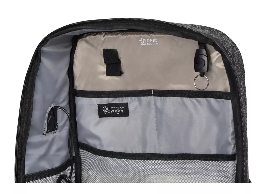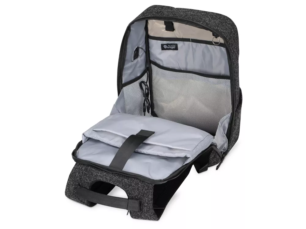 Безопасное хранение личных вещей и персональных данных во время деловых поездок и путешествий в любую погоду. - противокражный: специальная, стойкая к порезам ткань лицевая сторона рюкзака полностью защищена от несанкционированного считывания данных по протоколу RFID - вы можете класть карточки и электронные устройства в любое отделение органайзера и быть абсолютно уверенными в их защищенности молния основного отделения смещена вплотную к спине, что осложняет несанкционированный доступ к содержимому потайной карман на спинке карабин для фиксации на нем бегунков молнии - водостойкий: водостойкий материал водонепроницаемая молния - органайзер с 3мя отделениями - карабин для ключей - 2 внутренних боковых сетчатых кармана - отделение для планшета и ноутбука 15.6’’ фиксируется липучкой - внешний USB порт для зарядки устройств - ремень на спинке для надежного крепления на ручку чемодана - эргономичные лямки с регулировкой длины - дышащая сетка на спинке - 2 наружных кармана по бокам - вместимость 20 л - максимальная нагрузка 10 кг - нетканый мешок для хранения в комплекте - металлический шильд для лазерной гравировки снаружи основного отделения.