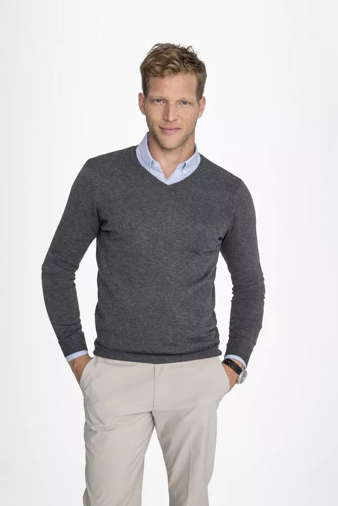 Облегающий пуловер с V-образной горловиной, который отлично сидит на фигуре.