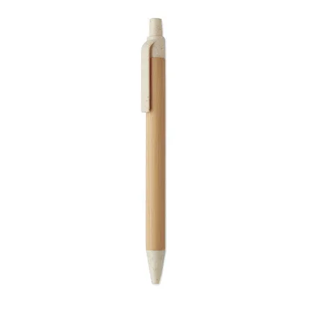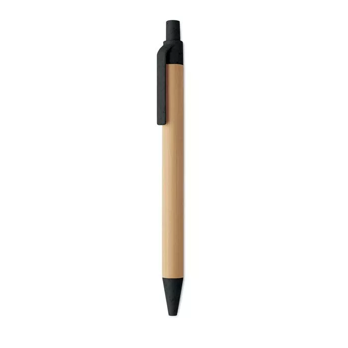 Push button ball pen with bamboo barrel and wheat straw (50%) and ABS plastic (50%) fittings. Blue ink.
